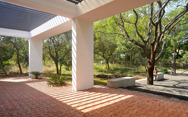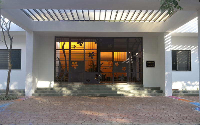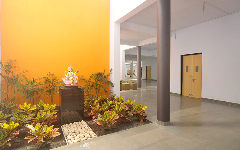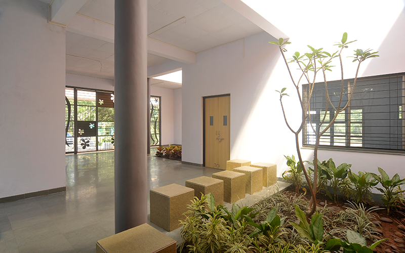 Total Area covered around 13500 square feet with 11 Classrooms each having its own court with pergola. Maximum existing tress have been reatained because of the stepped planning.